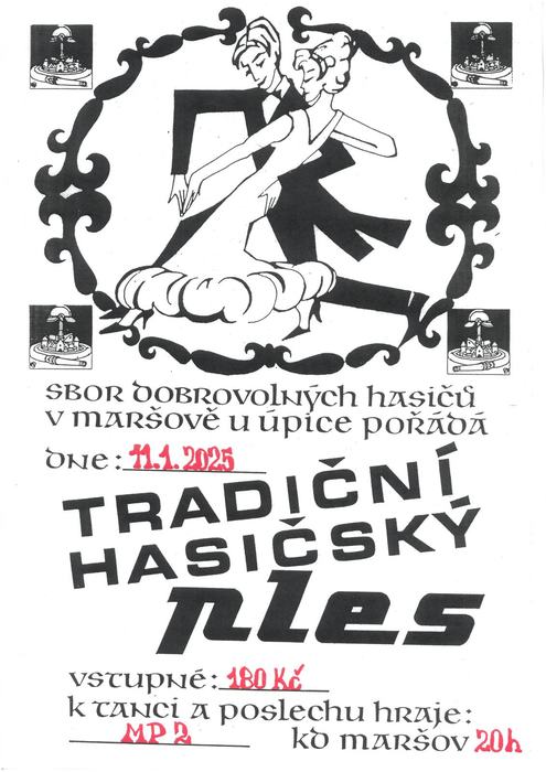 Sbor dobrovolných hasičů Vás zve na tradiční hasičský ples, který se koná v sobotu 11. ledna od 20.00 hod v kulturním domě. Občerstvení je zajištěno. Nebude chybět ani bohatá tombola. K tanci a poslechu zahraje oblíbená kapela MP2.