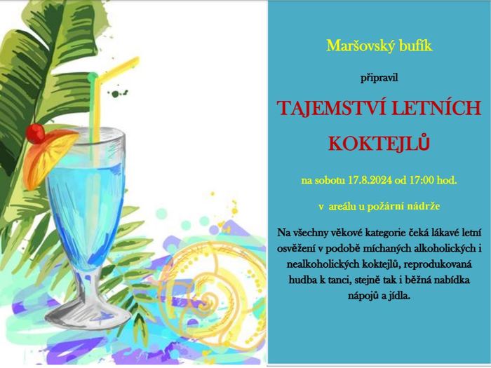 Maršovský bufík Vás zve tuto sobotu 17. srpna na posezení při míchaných drincích. Těšit se můžete na různé alko a nealko koktejly. Začátek od 17.00 hod. Nebude chybět standardní "bufíková" nabídka.