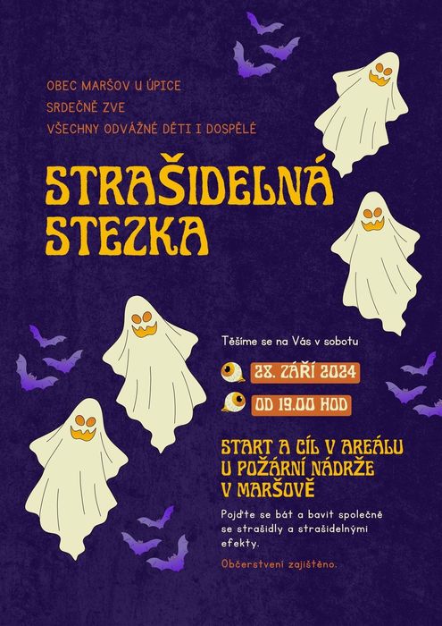 Zveme všechny odvážné děti i dospělé na strašidelnou stezku, která se koná v sobotu 28. září od 19.00 hod. Start a cíl bude v areálu u požární nádrže.